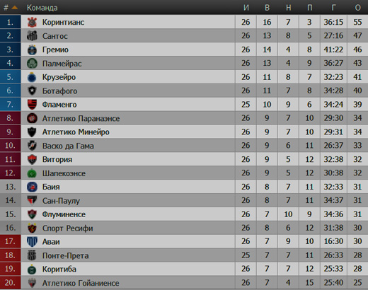 Бразилия. 26 тур. «Коринтианс» продолжает подпускать преследователей. В центральном матче тура чемпион проиграл дома «Сантосу» и, скорее всего, выбыл из гонки. «Палмейрас» владел ощутимым игровым перевесом по ходу матча, но ставка на умение Деверсона выиграть верх провалилась из-за космической игры на втором этаже защитника гостей Вериссимо. Лукас выиграл нереальные 18 единоборств из 18, а за пятнадцать минут до конца Рикардо Оливейра замкнул кросс Бруно Энрике, добыв победу для «рыб». Выиграл наконец и «Гремио». «Мушкетеры» три тура играли лучше оппонентов, в итоге уступая. Лучше они были и в этот вечер, хотя едва вновь не потеряли очки. Хозяев вытащил Бето да Силва, вышедший на замену за пятнадцать минут до конца. Зато «Коринтианс» вновь оступился. Лидер гостил у набравшего хороший ход «Крузейро». Рафинья вывел хозяев вперёд в середине первого тайма, после «лисы» решили сыграть на удержание. Не дотерпели меньше 10 минут. «Коринтианс» заработал пенальти на 84-й, а вышедший на замену Клайсон чётко его реализовал.«Спорт Ресифи» постигло очередное фиаско. «Сан-Паулу» вышел вперед благодаря голу Гильерме за десять минут до перерыва. После этого хозяева отдали инициативу сопернику и спокойно сохранили минимальный перевес. «Лев» проиграл пятый матч из последних шести и продолжает падение в таблице. Мощная беспроигрышная серия «Аваи» прервалась в самый неподходящий момент – дома с главным пока аутсайдером, но прямым конкурентом. «Атлетико Гойаниенсе» был лучше и победил по делу. Гости должны были забить ещё до перерыва, но за «Аваи» сыграла штанга. Сильно проведенный дебют второго тайма решил исход встречи в пользу «Драконища». От двух голов за пять минут «Аваи» уже не оправился. Один из самых ярких матчей тура был сыгран в Рио-де-Жанейро, где «Ботафого» оборвал свою впечатляющую серию из четырех побед подряд. «Витория» начала лучше. На исходе трети тайма Треллез угодил штангу, а Давид первым успел на добивание. В середине тайма хозяева отыгрались усилиями Бреннера. На ещё одно попадание Треллеза в каркас «Ботафого» ответил дублем Бреннера, реализовавшего пенальти. И всё было под контролем у хозяев, но в компенсированное время «Витория» перевернула игру. Лима на последней минуте замкнул подачу Неилтона, сравняв счет. На второй добавленной хозяева остались вдесятером, а на четвертой пропустили снова. Вышедший на замену Данилиньо принес победу гостям. В схватке двух «Атлетико» благодаря дублю Робиньо сильнее оказались «петушки», что позволило «Атлетико Минейро» догнать «Атлетико Паранаэнсе» по числу очков. Дуэль соседей по середине турнирной таблицы завершилась вничью. «Васко да Гама» и «Шапекоэнсе» обменялись голами на экваторе каждого из таймов, причем защитник гостей Рейналдо сперва привёз гол в свои ворота, а затем реабилитировался, поразив чужие. «Байя» упустила шанс обойти обоих, не удержав победу над тонущей «Коритибой». Хозяева забили в раздевалку, в дебюте второго тайма гостей спала штанга, а на его экваторе Рилдо сравнял счёт. Концовка выдалась нервной, арбитр раздал массу «горчичников», но склонить чашу весов в свою пользу никому не удалось. Результаты 26-го тура ![]() Турнирная таблица ![]() Бельгия. 9 тур. «Брюгге» наращивает отрыв. «Генк» еле унёс ноги от осевшего на самом дне «Эйпена». Испанский ветеран Луис Гарсия два