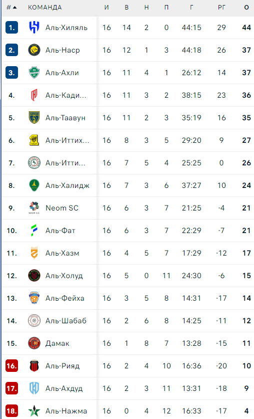 В чемпионате Саудовской Аравии сыгран 17-й тур. Лидирующий в турнирной таблице "Аль-Хиляль" одержал очередную свою победу, разгромив со счётом 4:1 "Аль-Фейху". У команды Симоне Индзаги 44 очка. Далее в турнирной таблице идут "Аль-Наср" и "Аль-Ахли", у которых по 37 баллов. Жёлто-синие одолели "Дамак" со счётом 2:1. Победный гол забил Криштиану Роналду. Для 40-летнего португальца этот забитый мяч стал 960-м в карьере. Что касается команды Маттиаса Яйссле, то она разгромила "Аль-Халидж" со счётом 4:1. Благодаря хет-трику английского нападающего Айвена Тоуни. Также отметим, что команда Брендана Роджерса обыграла подопечных Сержиу Консейсау. Так "Аль-Кадисия" оказалась сильнее "Аль-Иттихада". ФНК подводит итоги 17-го тура саудовской премьер-лиги.