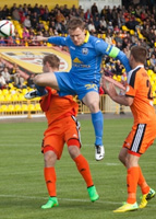 В ещё одном интересном матче тура встречались "Слуцк" и "Нафтан". Хозяева отчётного матча пока являются явным аутсайдером первенства. А вот гости заявляют о себе не только в качестве крепкого середняка, но и как о претенденте на борьбу за зону еврокубков. Стоит отметить, что "Нафтан" в первых пяти турах не проиграл ни одного матча, составив по этому показателю компанию БАТЭ и "Шахтёру". Кстати, в случае победы "Нафтан" набирал бы 12 очков и врывался в первую тройку, разделяя второе место с "горняками". В общем, ставки для команды Валерия Стрипейкиса были высоки. Хотя и "Слуцк" явно хотел сдвинуться с мёртвой точки. На счету команды Юрия Крота был всего лишь один балл после пяти туров. Первый момент создали хозяева, когда Егор Зубович получил мяч в штрафной соперника, нанёс сильный удар по воротам, но голкипер "Нафтана" спас свою команду. Вскоре всё тот же Зубович с левого фланга сместился в центр и вновь опасно выстрелил по воротам гостей, однако и на этот раз Игорь Довгялло, проводивший первый матч в сезоне, сыграл просто великолепно. После этого игра заметно успокоилась и мяч застрял в центре поля. "Нафтан" пытался что-то придумать в атаке, однако у гостей практически ничего не получалось. В первом тайме зрители забитых мячей так и не дождались. А вот едва началась вторая половина встречи, как команда из Новополоцка открыла счёт. На 53-й минуте последовала подача с углового, Руденок ошибся на выходе, и на дальней штанге Гунчак без особого труда поразил пустые ворота хозяев! После этого футболисты "Слуцка" активизировались в атаке, но моментов у ворот соперника создать не сумели. Зато на 71-й минуте гости могли удвоить своё преимущество в счёте. Елезаренко слева с линии штрафной покатил мяч в центр на одинокого Демидовича, который расстреливал ворота, но голкипер "Слуцка" спас свою команду от уже практически стопроцентного гола. На 77-й минуте хозяева могла отыграться, когда эффектный удар после подачи от угла поля исполнил Мурат Хотов, однако мяч прошёл в сантиметрах от "девятки". Далее "Нафтан" ушёл в оборону и спокойно довёл дело до победы. Таким образом, "Слуцк" с одним баллом остался на последнем месте в турнирной таблице, а "Нафтан" догнал "Шахтера", набрав уже 12 очков.