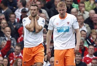 Но сколько бы ни было желания у "Блэкпула" и его поклонников остаться в элите английского футбола, в середине первого тайма их и без того плачевное положение усугубил гол Чжи-Сун Пака. Кореец подкараулил грубейшую ошибку голкипера и защитника соперников, не понявших друг друга в простом эпизоде, и вот так на ровном месте техничной подсечкой над Гилксом вывел свою команду вперед - 1:0. Оказавшись в такой неприятнейшей ситуации, гости даже нашли в себе силы прижать гранда к его собственной штрафной. Вот только итогом этого штурма едва не стал второй гол в их собственные ворота, который за 13 минут до перерыва должен был забивать Бербатов. После прострела от Пака с правого фланга сразу двое защитников "мандариновых" как-то нелепо промахнулись по мячу, но и сам болгарский форвард проявил себя не с лучшей стороны, пальнув прямо по позиции голкипера. Так что то, что незадолго до перерывы приезжая команда счет сравняла, было к лучшему в плане поддержания зрелищности игры. И кому же забивать в рядах "Блэкпула" в столь ответственный момент, если не Адаму? Чарли нанес настолько шикарный удар со штрафного, что у ван дер Сара не было ни единого шанса его парировать - 1:1. Да и момент был выбран очень удачно, так как на то, чтобы выплеснуть свою злость, у манкунианцев в первом тайме уже не оставалось времени.