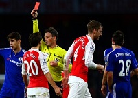 Вскоре уже «синие» провели хорошую атаку, в ходе которой после серии отскоков и рикошетов настырный Виллиан протыкал в касание мяч в ворота с нескольких метров. Снова Чех выручил. А ещё через пару минут качелей случился ключевой эпизод в этой игре. Сперва в затяжной атаке лондонцы претендовали на пенальти, намекая на попадание мяча в руку. Судьи считали иначе. Виллиан тут же улетел в контратаку, тормознул в центральном круге и выдал шикарный пас вразрез на ход Диего Косте. Мертезакер пытался сыграть в мяч, настигая убегающего один на один бразильца, но чуть опоздал и заплел в подкате ноги нападающему. Клаттенбург без колебаний предъявил прямую красную защитнику «Арсенала». Стандарт гости запороли, но расстроились не сильно.
