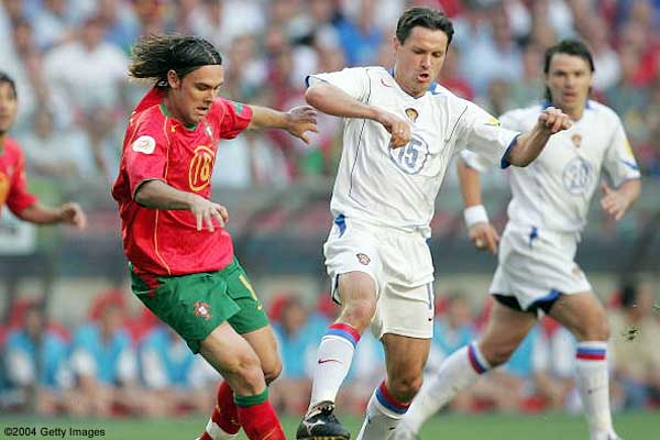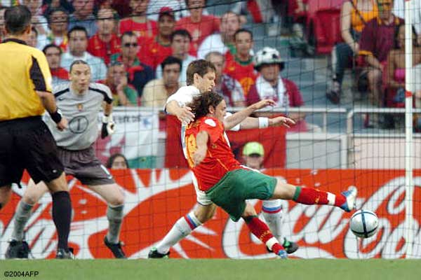Португальцы с первых минут завладели инициативой, в то время как игроки сборной России вновь допускали огромный процент брака в передачах и очень редко переходили на половину поля соперников. На 7-й минуте хозяевам поля повезло - первая острая атака у ворот сборной России завершилась быстрым голом. Причем пропущенный мяч до боли напоминал победный гол Валерона в первом матче с Испанией. Полузащитник "Порту" Деку великолепным пасом нашел в штрафной своего одноклубника Манише, который из-под Евсеева точно пробил в нижний угол. В ответ россияне вновь нахватали желтых карточек, из-за чего следующий матч с Грецией пропустит Алексей Смертин. После забитого гола хозяева поля продолжали владеть инициативой. На 29-й минуте после флангового навеса Деку второй гол едва не забил Рикарду Карвалью, но мяч после удара головой португальского защитника прошел рядом со штангой. Португальцы вряд ли показывали выдающийся футбол, но в действиях игроков нашей команды просматривалась какая-то обреченность. Тем не менее во второй половине тайма сборной России удалось отодвинуть игру от своих ворот. Но