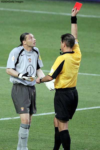 опасный момент у ворот соперника возник лишь однажды. На 43-й минуте Аленичев заработал опасный штрафной, но Каряка пробил выше ворот. Вся надежда болельщиков и тренерского штаба сборной России была на второй тайм. Но на последней минуте первой половины встречи произошел эпизод, который серьезно повлиял на судьбу матча. Все началось с кошмарной передачи назад голкиперу Лоськова из середины поля. В результате чего, чтобы Паулета не вышел один на один, Овчинникову пришлось выйти за пределы штрафной площади и лежа остановить мяч. Но норвежский судья Терье Хауге усмотрел в действиях вратаря сборной России игру рукой за пределами штрафной и показал Овчинникову красную карточку. После многочисленных телевизионных повторов было ясно, что Овчинников руками мяча не касался. Сборная России уже в который раз пострадала от судейской ошибки...