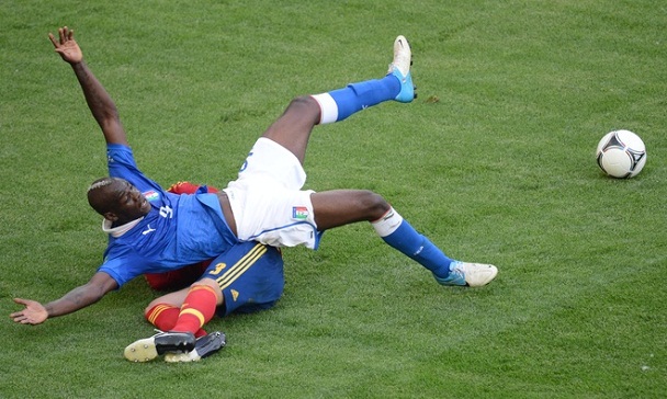 Балотелли падает в штрафной, но пенальти нет.