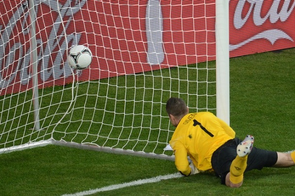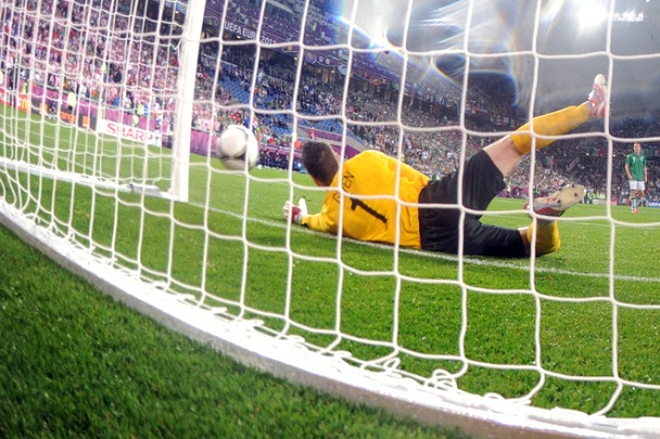 Курьезный мяч от головы Гивена влетает в ворота ирландцев.