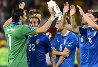 Четвертый тайм начался с очередной волны позиционных атак Италии. Пытались они аккуратно так подкатить к воротам большими силами. Неплохо Маджо простреливал в штрафную, когда Лескотт поскользнулся, но Терри подстраховал. Потом Диаманти справа входил в штрафную, не стал подавать на Балотелли, а неточно пробил, получив от Марио критику. Новые опасности возникли со штрафного итальянцев. Подача первая не дошла до Балотелли, повторную вынес Кэрролл, пришедший назад. Но выйти из обороны британцы не смогли – свалили Маркизио. Этот стандарт исполнил Балотелли. Ужасно исполнил – в небеса. Очередная атака Италии, которая прижала противника уже вплотную, прошла справа. Маджо бил прямой наводкой, но попал в Коула. Перевели атаку на другой край. Там Бальцаретти четко прострелил на Диаманти, который пробил в касание мимо. Вскоре форвард опять оказался на свободе справа. На этот раз он резко дернулся к лицевой и прострелил. Ночерино головой подрезал снаряд под перекладину. Однако судья усмотрел у него офсайд. Так, под мерные накаты Италии матч и завершился, перейдя в серию пенальти. В ней нервы разыгрались не на шутку. Преимущество англичанам сначала подарил Монтоливо, не попав по воротам, однако потом итальянцы не промахивались, а вот Коул и Янг свои удары не реализовали.
