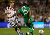 Одержав непростую победу над Шотландией (3:2) в прошлом туре отборочного этапа, сборная Германии вырвалась, наконец, на первое место в группе D. Произошло это для немцев в самый нужный момент накануне решающих октябрьских баталий. В Дублин команда Йоахима Лёва прибыла уже с целью обеспечения досрочного выхода на чемпионат Европы-2016. Причём, для этого гостям достаточно было и ничьи. Кстати, именно с таким исходом завершился матч между этими командами в первом круге. Ирландцев же, разумеется, устраивала только победа. Только она позволяла им ещё надеяться на прямой выход на турнир во Францию. Более того, потеря очков "парнями в зелёном" могла ухудшить их положение и с точки зрения борьбы за третью строчку. Так как Шотландия в случае победы над Польшей могла вплотную подобраться к своему конкуренту. Ирландии в своей истории дважды удавалось обыграть Германию, но оба раза это были товарищеские матчи. Последняя же официальная встреча соперников в Дублине завершилась для хозяев полнейшим фиаско - поражением со счётом 1:6. Немцы, разумеется, выступали фаворитами в этом поединке, к тому же они подходили к нему практически в оптимальном составе, у бундестим отсутствовал лишь Лукас Подольски. Мартин О`Нил же не мог рассчитывать на дисквалифицированных Гленна Уилана и Джеймса Макклина, а также травмированных Гарри Артера, Симуса Коулмена, Кирана Кларка и Стивена Куинна.