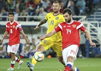 Лишь в середине первого тайма сборная России создала первый по-настоящему опасный момент в матче. После фланговой передачи Миранчук принял мяч в штрафной площади и нанёс плотный удар, который был заблокирован одним из защитников. Далее команда Черчесова заработала несколько угловых, розыгрыши которых ничем интересным не заканчивались. По-прежнему очень академично действовали россияне в нападении. Совсем мы не видели настоящего напора в их действии. На удивление пассивно выглядел Дзюба. Да, его очень плотно опекали футболисты сборной Казахстана, однако и сам Артём перемещался не так много, как мы к этому привыкли. На исходе хозяева отметились запоминающимся проникновением внутри чужой штрафной площади. Фернандес снабдил передачей Дзюбу, а Артём моментально переадресовал снаряд на Головина, на которого моментально выдвинулось несколько соперников. Александр всё-таки довёл дело до завершающего удара, но толковым он не оказался. Черчесов был крайне недоволен происходящим на поле. Он постоянно покидал границы технической зоны и пытался завести своих подопечных. Более того, в данном игровом отрезке казахи не только сидели в обороне практически полном составе, но и всё чаще стали находить возможности для организации ответных контрнаступлений. Несколько раз гости даже доходили до подступов к штрафной площади и периодически наносили акцентированные удары по воротам Гилерме. Правда, поводов серьёзно вступить в игру у вратаря сборной России не было. На 33-й минуте нашим футболистам наконец-то удалось воспользоваться свободным пространством на чужой половине поля и провести толковую атаку сходу. Миранчук протащил мяч и снабдил своевременным пасом Головина, с плотным ударом которого не без труда справился Непогодов. Очередной угловой футболисты сборной России разыграли неудачно. До перерыва Головин отметился ещё одним запоминающимся выстрелом по чужим воротам, после которого снаряд пролетел намного выше перекладины. Так и не смогла наша команда конвертировать территориальное преимущество хотя бы в один забитый мяч. Слабо провела тайм команда Черчесова.