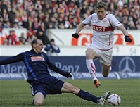 Гол придал уверенности и сил «Фрайбургу». Гости умело разрубали конструкции «Штутгарта», делая так, что игроки Лаббаддии работали разрозненно, в отрыве друг от друга. В таком положении их было просто остановить. Именно командности и изобретательности недоставало «швабам», которые ни одной толковой комбинации (именно комбинации) не смогли разыграть в отличие от соперника. Потому монолитная оборона «Фрайбурга» хаотичные индивидуальные набеги «Штутгарта» ликвидировала легко. Кроме сплоченной защиты в два ряда гости использовали неплохо и выходы в атаку, действуя слаженно и четко взаимодействуя. Тоньше, цельнее работала гостевая дружина. А уж после гола так и вовсе «Фрайбург» начал диктовать условия игры, таская мяч по-всякому, смущая игроков хозяев. «Штутгарт» смотрелся растерянным и потерянным, не понимая, что делать во время вихревых наскоков соперника. Лишь числом удавалось «швабам» обороняться. И тем не менее «Штутгарт» нашел в себе силы, чтобы взвинтить темп и начать создавать хоть какие-то признаки давления. Все также держалось на индивидуальном мастерстве. В частности, Гентнер совершил неплохой проход к штрафной и заработал опаснейший стандарт. Бил Дидави, но в ближнюю девятку немного не попал. Затем все тот же Гентнер ворвался в штрафную слева, накрутив эффектно целую группу оппонентов, да только прострел не прошел – защитников оказалось слишком много. Во всяком случае, «швабы» насели на несколько минут на штрафную Бауманна, окружив ее и загрузив многочисленными подачами. Именно на навесы и прострелы сваливались хозяева, прессингуя по флангам. Такие ходы используют, когда изобретательности не хватает, а сил и ресурсов для оказания давления достаточно. Вот и бомбили с флангов, закидывая туда мячи целыми обоймами. «Фрайбург» в такие моменты вжимался в штрафную и терпеливо отбивался, работая и числом, и организацией. «Штутгарт» нередко суетился и тем самым свои атаки губил на стадии, близкой к завершению. Да уж, суета еще никому на пользу не шла. Так первый тайм и завершился. Фанаты встретили свисток на перерыв своим свистом, что понятно. Их любимцы не показали качественной игры. На фоне «Фрайбурга» выглядели просто менее организованно.