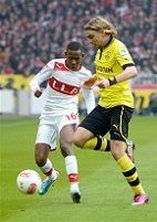 Как и ожидалось, противостояние "Боруссии" и "Штутгарта" в 27-м туре Бундеслиги вышло очень упорным. При этом нельзя сказать, что гости перед Лигой чемпионов берегли силы. В первом тайме преимущества не было ни у одной команд. Уже в середине тайма дортмундцам пришлось сделать вынужденную замену - сломавшего нос Марселя Шмельцера сменил Лукаш Пищек, который впоследствии стал героем матча. Именно он на 29-ой минуте после передачи Ройса со штрафного открыл счёт. В оставшееся время первого тайма гостям грамотно удавалось сдерживать атаки соперника. Но после перерыва "швабы" прибавили, и логичным итогом этого стал гол Александру Максима, забитого на 63-ей минуте. "Штутгарт" ринулся вперёд побеждать, но все планы подопечных Бруно Лоббадии перечеркнуло удаление Георга Нидермайера, получившего вторую жёлтую карточку. Этим обстоятельством умело воспользовались гости, которые сумели-таки вырвать победу после гола Роберта Левандовски, забившего свой 19-ый гол в чемпионате. Таким образом, "Боруссия" сохранила четырёхочковый отрыв от "Байера" и в хорошем настроении подойдёт к четвертьфинальному поединку в Лиге чемпионов с "Малагой" в среду. Кроме того, досрочное завоевание...  |