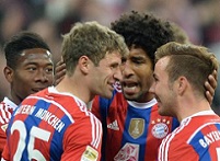 «Падерборн» бодро начал, провёл несколько атак, а вышедший на острие Качунга даже отметился эффектным, но неточным ударом в падении, но довольно быстро «Бавария» в привычной манере забрала мяч под свой контроль. И первая же толковая комбинация хозяев завершилась взятием ворот. Роббен пасом вразрез нашёл в штрафной Мюллера, а тот пяткой скинул мяч под удар Гётце. Марио передачей воспользовался, технично уложив мяч точно в нижний угол. Мюнхенцы решили не затягивать с решением всех вопросов об исходе матча и обрушили шквал атак на ворота Крузе. Левандовски дважды бил, но в первом случае не попал, а во втором справился Крузе. Вскоре уже Алаба оказался на углу вратарской, но его плотный удар пришёлся мимо створа. Минутой позже Гётце практически на рандеву с голкипером оказался после паса Мюллера и пробовал поймать его на противоходе – не вышло. Гол назревал и случился уже на 14-й минуте. Вновь вывели на ударную позицию Левандовски. Это Лам нашёл поляка на углу штрафной, а открывавшийся на грани офсайда Роберт, недолго думая, пробил в дальний угол. Мяч, прошив руки Крузе, влетел в сетку. Тут же форвард мог оформлять дубль, но мяч после его выстрела с угла вратарской рикошетом от защитника ушёл за лицевую. «Падерборн» выглядел абсолютно не готовым к таким скоростям. Буквально через минуту всё тот же Левандовски легко убежал от Цилера и сходу пробил, но взял чуть выше створа. К середине тайма чуть сбавили хозяева обороты и тут же нарвались на контрвыпад. Уали убежал почти от середины поля на рандеву с Нойером, но пробил точно в руки голкиперу. Но это был лишь эпизод. «Бавария» продолжала владеть колоссальным игровым преимуществом, постоянно нагнетая давление у ворот гостей и плетя свои бесконечные кружева на подступах к штрафной «Падерборна». Вскоре уже Гётце откровенно простил гостей. Роббен подачей с корнера нашёл Левандовски, а тот сбросил мяч под удар Гётце, однако Марио с нескольких метров отправил его на трибуны. Следом Роббен в своём стиле сместился в центр и с линии штрафной обводящим ударом отправлял мяч в ворота, но он прошёл в притирку с дальней стойкой. Пару минут спустя ещё одну попытку предпринял Арьен, но получилось менее точно. При этом едва мюнхенцы расставались с мячом, как тут же устраивали высокий прессинг, в результате чего статистика просто неприлично выглядела – почти в четыре раза больше владела мячом «Бавария», а вот до разгрома дело никак не доходило. Корявый удар Мюллера едва не трансформировал в голевой пас Левандовски, чуть-чуть не дотянувшийся до мяча. Следом Гётце, который вполне бы уже мог начать продажу индульгенций, загубил момент. Мяч после удара Марио и рикошета снова разминулся с воротами. Концовка тайма прошла спокойно. Гости должны были быть довольны, поскольку могли бы проигрывать уже с теннисным счётом.