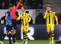 На кураже "Хоффенхайм" вновь активизировался и стал активнее прессинговать соперника, который снова оказался в роли догоняющего. На 27-й минуте игры дортмундская команда провела опасную атаку через правый фланг, наступление увенчалось прострелом на ближнюю штангу – защитник спешно отправил футбольный снаряд за лицевую линию. После розыгрыша назначенного стандарта у ворот хозяев возник настоящий пожар, но потушил его свисток арбитра – Бранд зафиксировал нарушение правил со стороны решительно боровшегося в штрафной Бартры. На 31-й минуте игры восстановить равновесие в счете мог Дембеле, к которому мяч очень удобно прилетел после розыгрыша стандарта, тот пробил с угла вратарской, но угодил в оказавшегося на пути мяча защитника. У Дембеле появилась вторая возможность пробить – мяч снова принял на себя оборонец. Еще одно стандартное положение через минуту завершилось тем, что борьбу на втором этаже выиграл Шмельцер, который пробил под перекладину, но чуть-чуть не попал в створ. После этого игра успокоилась, Дортмунд владел мячом, но что-то интересное создать у чужих ворот до поры до времени не мог. За пять минут до перерыва Дембеле заработал для "Боруссии" очередной перспективный стандарт, который вызвался исполнять Шмельцер – мяч на себя приняла "стенка". И тут же дела "Боруссии" стали совсем плохи: "Хоффенхайм" бросился в контратаку, которую фолом против Амири сорвал Ройс – судья наград полузащитника второй жёлтой карточкой, которая тут же превратилась в красную. Интересно, что это удаление стало для Ройса первым не только в первой Бундеслиге, но и во второй.