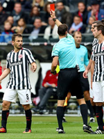 В перерыве Карло Анчелотти сделал первую замену. Хаби Алонсо поменял Саншеш. Логичное перестановка. Не хватало «Баварии» мобильности в центре поля. Вторая половина встречи стартовала с резвой атаки гостей, завершившейся неточным дальним выстрелом Киммиха. Отдавать инициативу противнику франкфуртцы не планировали. У них продолжали активно работать фланги, которые продолжали активно утюжить Очипка и Чендлер соответственно. Одно из стремительных наступлений со стороны «Айнтрахта» завершилось неточным ударом Фабиана из-за пределов штрафной площади. Продолжал коллектив Нико Ковача действовать смело, без тени робости. Не боялись они прозевать разящую контратаку противника. Впрочем, скоростных выпадов в исполнении мюнхенцев мы практически не видели. Правда, на 53-й минуте лидер Бундеслиги сподобился-таки на организацию достойной атаки сходу и должен был забивать, но Коман с близкого расстояния пробил в штангу. «Простил» француз франкфуртцев в данной ситуации. Следом «Бавария» подала угловой, который ничем любопытным не завершился. А на исходе часа игрового времени Градецкий наконец-то показал себя во всей красе, в эффектном прыжке потащив фирменный обводящий выстрел Роббена метров с двадцати. Заметно прибавил «рекордмайстер» в движении в эти минуты. Настоящий натиск на чужие ворота организовала команда Карло Анчелотти и своего всё-таки своего добилась. После розыгрыша углового мяч отскочил у Саншеша, удар у которого, откровенно, не получился, однако игровой снаряд удачным образом отскочил к Киммиху, и тот, быстро сориентировавшись, поразил цель выстрелом с близкого расстояния – 1:2. Всё закономерно. Наконец-то мюнхенцы заиграли так, как мы от неё этого ждали. На этом беды «Айнтрахта» не закончились. Спустя пару минут команда Нико Ковача осталась в меньшинстве. Хусти не смог совладать со своими эмоциями, устроил перепалку с соперниками и отправился досматривать встречу в раздевалку.