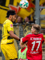 Штрайх скорректировал оборону, усадив Штенцеля и Кемпфа. Сеюнджю и Кюблер заняли вакантные позиции, а сама формация сменилась на четыре в линию. В центре поля расположились Абраши и Сьерро, а справа – новичок Раве. Нидерлехнер остался в запасе. У гостей только Шмельцер подменил Загаду на левом фланге, а Ярмоленко снова начал на скамейке. Дебют остался за хозяевами, которые уже на шестой минуте вполне могли выйти вперёд. Кляйндинст выскакивал один на один после обреза дортмундцев в центре поля, однако Бюрки вовремя сократил угол обстрела и выиграл дуэль у нападающего «Фрайбурга». Дортмундцы ответили парой своих атак на исходе стартовой десятиминутки. Сперва Гётце пробивал из-за штрафной, но удар Марио успел накрыть Сьерро, а следом уже Обамеянгу удалось отклеиться от опекуна и замкнуть подачу Шмельцера. Выше створа пробил габонец. Постепенно игра успокоилась и переместилась в середину поля, где в середине тайма на ровном месте получил какое-то повреждение Бартра. Испанец ушёл сразу в подтрибунное помещение, уступив место Топраку. Пару минут спустя Кюблер отоварил по ногам Филиппа, которому тоже потребовалась помощь медиков.