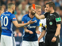 Дитер Хеккинг не стал менять победный состав "Боруссии", выпустив тех же футболистов, что и во встрече с "Вольфсбургом". У "Шальке" в нападении вместо Ди Санто вышел Арит, а в центре обороны у "кобальтовых", помимо Керера и Налдо, занял место Стамбули. Гости быстро обосновались в Гельзенкирхене и уже на первой минуте заработали штрафной на правом фланге. Подача последовала на Вестергора, однако Ферманн первым был на мяче. "Жеребцы" не позволяли хозяевам подобраться к владениям Соммера, а на 6-й минуте гости организовали ещё один перспективный выпад по правому краю. Хофманн прострелил на дальнюю штангу на Азара, однако Ферманн снова оказался начеку. А вскоре "Боруссия" и вовсе упустила верный момент. Теперь уже игру на себя у менхенгладбахцев взял Азар, который слева ворвался в штрафную, прошёл Стамбули и прострелил во вратарскую, где мяч от Керера отскочил к Раффаэлу, но тот из выгоднейшей позиции не сумел пробить точно. Этот эпизод заставил хозяев "проснуться". В их ответной атаке Коноплянка вошёл в штрафную и откатил мяч под удар Бургшталлеру, однако выстрел Гвидо вовремя накрыл Вестергор. А на 12-й минуте в центре поля вспыхнула потасовка. Бенталеб нарушил правила на Штиндле, и Ларс стал выяснять отношения со своим обидчиком. Набиль призвал его успокоиться, стукнув по лицу. Главный судья встречи Харм Осмерс собрался было дать жёлтую карточку алжирцу, но, прибегнув к помощи видеоарбитра, достал карточку красную. Это удаление стало первым в карьере Бенталеба, и "кобальтовые" уже в начале поединка остались в меньшинстве. Получив численный перевес, гости ожидаемо прибрали мяч себе и принялись перекатывать его на чужой половине поля под свист трибун. А на 21-й минуте "жеребцы" едва не довели одну из своих позиционных атак до гола. Раффаэл с левого края от лицевой прострелил на Элведи, который пробил из выгодной позиции, но сфера попала в Керера, от него отскочила в Ферманна и улетела на угловой. Через некоторое время Вендт грубо сыграл в подкате на фланге на Калиджиури, и Оскар схлопотал от арбитра заслуженный "горчичник". Игра, в целом, развивалась в спокойном ключе. Гости не форсировали события, а хозяева были заняты преимущественно разрушением.