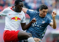 Баварцы явно были настроены решительнее соперника. Гости уже на первых минутах обозначили свои претензии на атакующую игру и дали «быкам» понять, что большую часть времени придётся проводить в обороне. Но неразрешимых задач перед соперником мюнхенцы не ставили. «Лейпциг» защищался без сумбура, легко пресекая все попытки баварцев довести мяч до Левандовского. В итоге первые четверть часа прошли без опасных моментов, что для встреч этих коллективов большая редкость. «Быки» и «красные» страсть как любят быстрые голы. Но этот матч был особенный. Здесь слишком много стояло на кону, и никто не рисковал открывать забрало и нестись вперёд без оглядки на свои ворота. И первый голевой момент зрители увидели аж на 29-й минуте. К этому времени «Лейпциг» успел перехватить инициативу, провести несколько перспективных, но ничем не завершившихся атак, и вновь уйти в оборону. Там его едва и не застал Левандовски. Лучший бомбардир Бундеслиги решил проявить себя в роли ассистента и прострелил с правого угла вратарской на Гнабри. Но Серж находился слишком близко к Гулачи, чтобы направить мяч мимо голкипера. Снаряд отскочил от вратаря на угловой, из которого гости ничего не выжали. Следовало мюнхенцам всё-таки взвинчивать темп и бросаться в атаку большими силами. Иначе их попытки наступать выглядели бесперспективными. Как уж малым числом вскрыть оборону «Лейпцига», если на помощь защитникам всегда прибегают нападающие? Таково требование Ральфа Рангника: форвард обязательно прибегает к своей штрафной на помощь товарищам. Это делали и Поульсен, и Вернер. Да и страшно сказать, «Баварии» явно не хватало изобретательности при организации атак. Вечные попытки продраться через правый фланг легко читались «быками», и Гнабри с Левандовски большую часть времени пребывали на голодном пайке. Шанс переломить этот вялый ход встречи у гостей был на 39-й минуте, когда польскому форварду всё-таки удалось выиграть верховую борьбу после подачи корнера и скинуть мяч на немецкого. Серж пробивал слёту в ближний угол, но Гулачи был настороже. Такими Петера не озадачишь, нужно что-нибудь похитрее. И в концовке тайма баварцы попытались сделать ставку на скорость. Под занавес отрезка у них вырисовывалась очень симпатичная быстрая атака, но Коман с Левандовски умудрились вступить в борьбу за мяч друг с другом. Снаряд был потерян прямо у чужой штрафной. «Бавария» не походила на себя настоящую. Но если уж критиковать, то обоих соперников. «Лейпциг» ведь впереди тоже ничего не показал. Только оборонительные действия хозяев заслуживали похвалы. Особенно это касается Конате. Ибраима снимал весь воздух и перехватывал весь низ.
