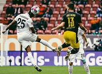 Территориальное преимущество «Боруссии» выглядело тотальным. Однако хозяева выстроились в две оборонительные линии, застегнувшись на все пуговицы. И у «шмелей» стали возникать заметные проблемы в созидании. На 24-й минуте Нидерлехнер снова выскочил с глазу на глаз с Бюрки и, обведя его, споткнулся о ногу вратаря. Хозяева просили у судьи пенальти, однако у Флориана вновь было зафиксировано положение «вне игры». Через некоторое время у «Аугсбурга» прошёл ещё один опасный выпад. Калиджиури получил длинный заброс на левом фланге, выманил на себя Бюрки и прострелил во вратарскую, но там свою команду выручил Хуммельс, вынесший мяч подальше. На 29-й минуте Грегорич влетел в центре поля в Рейну и увидел от арбитра первую жёлтую карточку в матче. А следом довольно грубо на Беллингеме сфолил Хедира и также схлопотал «горчичник». На поле разгорелась потасовка, которую арбитр погасил, «наградив» предупреждениями Холанна и Гаувелеува. Темп игры из-за постоянных остановок упал. Дортмундцы катали мяч поперёк поля. На 34-й минуте после ошибки Санчо «Боруссия» едва не получила опасную контратаку на свои ворота. «Аугсбург» очень уверенно смотрелся в обороне, не позволяя гостям проникать в свою штрафную. На 38-й минуте Менье наступил на ногу Грегоричу и тоже получил жёлтую карточку. Ну а затем «Аугсбург» неожиданно открыл счёт. Джан заехал локтём в лицо тому же Грегоричу на правом фланге, и «фуггеры» получили право на опасный стандарт у чужой штрафной. Калиджиури навесил во вратарскую, откуда набежавший Удуохай с нескольких метров головой поразил цель – 1:0. Гости выглядели растерянными. Брака в передачах у них стало только больше. На 44-й минуте едва не «помог» дортмундцам Гикевич, но после его рискованной передачи Холанн до мяча не достал. Затем гости подали угловой, однако ничего из него не выжали. В итоге первый тайм остался за «Аугсбургом».