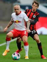 Сразу бросился в бой «Лейпциг», моментально попал в офсайд Айдара, получивший передачу от Забитцера. Начало яркое, но только из положения «вне игры». Нкунку прошелся по ноге Дурма, словно по мостовой прогулялся, получил за это желтую карточку Кристофер. Но не только подобными действиями «быки» отличались, они и кое-что опасное у ворот противника сумели создать. Ольмо от Нкунку классную передачу получил, после чего влетел в штрафную конкурента. Хинтереггер оступился, Дани перебросил через Траппа, только вот и выше цели получилось. Айдара как-то с передачами чудил, Силва зато неплохо мяч перехватывал, но без особого фанатизма, к опасным моментам это не приводило. Нкунку выглядел недурно, однако как-то терялся иногда он в центре поля. После подачи с фланга Ольмо в штрафную передал «снаряд», но партнеры не поддержали. Камада с дальнего расстояния выстреливал, но снова мяч в цель не летел. Вроде и скорости приличные, и комбинации красивые, но не могли довести дело до ударов по воротам команды.