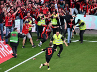 Но счастье человеческое, оно такое. Пустили в ход пиротехнику фанаты хозяев, дымка нависла над полем. Все это затрудняло движения по полю, но необходимо было доводить задуманное до реального. На 90-й минуте один из лучших (если не самый лучший) игроков Бундеслиги, а именно Гримальдо, оформил голевую передачу на Вирца, который оформил хет-трик. Тут уже вообще сотни болельщиков прорвались на поле, стюарды не успевали их останавливать. Посмотрел на все это дело главный арбитр… да просвистел. Без всяких санкций, просто финал. Вот тут и Вирца отпустило, который стал обнимать первых встречных, все поняли, что они совершили подвиг. Хаби Алонсо тоже ринулся вперед. А людей на поле стадиона было столько, что вообще газон пропал с радаров. Невероятное достижение. Главное сейчас эмоционально не выгореть и продолжить свое победное шествие в Лиге Европы и Кубке. Образцовый матч, чемпионская игра, леверкузенцы заслужили этот титул, бесспорно.