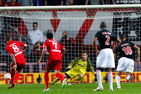 С первых же минут матча стало ясно, что никто не побежит на чужие ворота сломя голову. Максимальная концентрация, игра в пас и минимум риска - всё это присутствовало на первых минутах игры. Безусловно, для зрителя, который любит красивый футбол, встреча могла показаться не интересной, а зря, ведь это было только её началом. Но всё же нервозность с обеих сторон проглядывалась, в следствии чего мяч постоянно находился то у одних, то у других. "Твенте" первые десять минут давал свободно двигаться сопернику. ПСВ старался воспользоваться предоставленным, но с большой оглядкой на свои ворота. На 8-й минуте Джуджак подал угловой и Энгелаар пробил прямо в руки Михайлову. Опасным момент не назовёшь, но для статистики первый удар был сделан. "Твенте" ответил похожей манерой, со стандарта, но это было уже куда опаснее. Янссен подал угловой, защитники гостей упустили из виду Люка Де Йонга, который показал Энгелаару, как, по-настоящему, надо бить головой. Мяч полетел точно в ближний нижний угол. Исакссон уже физически не мог спасти свою команду, зато Джермейн Ленс это сделать сумел. Форвард решил сыграть в голкипера и вынес мяч рукой прямо с ленточки ворот, но свисток рефери промолчал. Да, возможно такой наглости со стороны Ленса, как у Суареса на Чемпионате Мира, не было, но пенальти стоило поставить. Вполне и в меньшенстве мог оставить эйндховенцев Кевин Блом. Ждать ответа от ПСВ долго не пришлось. Быстро лишив соперника возможности подолгу держать мяч, гости провели опаснейший выпад, завершившийся ударом Баккала - в сантиметрах от ворот прошел мяч. Хотя, скорее всего, это был даже не удар. Мяч попал не на ту часть ноги и получился прострел вдоль ворот, на который, естественно, никто не среагировал из партнёров. Буквально тут же отличный шанс открыть счет получил Берг. Оборона "Твенте" дала сбой, чем тут же воспользовался форвард ПСВ, выскочив на рандеву с Михайловым. К счастью хозяев, переиграть кипера шведу не удалось. Обменявшись столь ощутимыми моментами, соперники вновь засушили игру. ПСВ подолгу разыгрывал мяч, безуспешно пытаясь найти новые щели в защите "Твенте", а сами энсхедцы никак не могли довести дело до удара. Удалось это сделать уже в самой концовке первого тайма, когда Люк Де Йонг пробил в ближний угол и Исакссон лишь коленями сумел отбить мяч. Чуть позже швед совершил грубейшую ошибку, в простой ситуации подарил шанс "Твенте", не умело сыграв на выходе. Казалось, момент истины пришёл и "красные" его не упустят, но нет, и в этот раз ПСВ повезло. Теперь уже Марсело вытащил мяч с ленточки ворот, правда в отличии от Ленса, ногой. События первого тайма заставляли обоих наставников серьезно поразмыслить в перерыве об игре своих подопечных в защите, конкретно Руттену еще и над тем, как повысить эффективность действий команды в завершающей стадии. Но если такие беседы и проходили, то больше пользы из них извлекли хозяева поля.