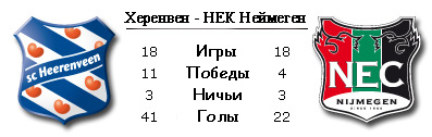 Прошлый сезон не задался с самого начала у обоих клубов. И если НЕК может себя утешать тем, что его футболист Бьорн Влеминкс в итоге стал лучшим бомбардиром, а команда выкарабкалась к границе десятки, то у "фризов" мало утешений. При приличном по голландским меркам составе "Херенвену" то и дело не везло, не мог коллектив найти своей игры и в итоге прозябал в нижней части таблицы, пока все пробегали мимо либо наверх, либо к зоне вылета, участвуя в увлекательной борьбе за жизнь. "Херенвен" все это время проспал на одном уровне. Теперь же команда намерена с первых туров взять быка за рога и вернуться в зону распределения еврокубковых мест. Это главная цель. Как и у НЕКа, в общем-то. В прошлом сезоне эти команды сильнейшего не выявили. Обе встречи завершились вничью - 0:0 и 2:2. НЕК вообще стал тогда самой "ничейной" командой лиги.