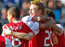 Роттердамский "Фейеноорд" прервал неудачную серию выездных матчей против "Аякса", длившуюся целых шесть лет. Очередной раунд великого противостояния завершился ничьей 1:1. "Аяксиды" вот уже второй тур кряду умудряются уйти от поражения находясь в меньшенстве. С одной стороны это всё же дорого стоит, но с другой потери очков сейчас совсем не кстати, тем более что АЗ не оступается и уже опережает подопечных Франка де Бура на целых восемь баллов. Это уже даже не интервал двух побед. В целом, "классикьер", а именно так называют дерби Роттердама и Амстердама, получился интересным, а самое главное, что итоговый результат закономерен. При удачном стечении обстоятельств и те, и другие могли победить, но фортуна была в этот день на стороне ничьи. По серии попаданий в перекладину в первом тайме, во втором команды всё же сумели поразить ворота друг друга. Первыми счёт открыли гости, после удачного добивания от Де Врея. Кульминация наступила на 64-й минуте, когда Кеннет Вермер нарушил правила на Гийоне Фернандесе и получил прямую красную карточку. Показалось, что шансов у "Аякса" очень мало. Но не тут-то было, спустя всего три минуты после удаления, Ян Вертонген подключился в атаку на угловой и головой вколотил мяч в сетку Мюлдера. Стоит добавить, что россиянин Дмитрий Булыкин получил больше игрового времени, нежели обычно, вот только кроме жёлтой карточки, ничем примечательным больше не отметился. Ну а матч, как уже было сказано, завершился логичной ничьей...