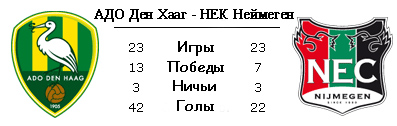 На выезде НЕК ещё ни разу в этом сезоне не побеждал, более того в последних трёх поединках три поражения с общим счётом 7:0. У поклонников Неймегена ещё в памяти крупное поражение от "Ден Хаага" в прошлом сезоне. Тогда гаагцы на своём поле обыграл НЕК 5:1. Один из мячей, к слову, тогда забил экс-игрок "Аистов" Дмитрий Булыкин. В прошлом туре НЕК проиграл в дерби "Витессу", да и вообще уже пять подряд матчей в Эре подопечные Алекса Пастора только проигрывают. В результате, не случайно их появление в подвале таблицы. "Ден Хааг" после побед над "Венло" и "Фейеноордом" в прошлом туре уступил "Роде" (4:1). На своём поле "Аисты" забили всего два гола. Гости помимо всего прочего испытывают серьёзные кадровые проблемы и как с ними справится Пастор, увидим.