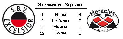 "Эксельсиор" пока что никак не может одержать свою первую победу в нынешнем сезоне. У "Хераклеса" же в активе их уже три. Правда вот на вызде нет ни одной. Альмельцы во всех 9-и турах обязательно хотя бы гол забивали. Шансы одержать первую победу на выезде очень велики, поскольку роттердамцы, при всём к ним уважении, являются самым главным аутсайдером в нынешнем первенстве. Фаворитом, естественно, являются гости, однако думается, что легко переиграть роттердамцев вряд ли удастся. Рискнём предположить, что хозяева как минимум не проиграют.