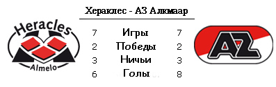 Неожиданно сложный матч Кубка Голландии против "Дордрехта" может сыграть злую шутку с лидером чемпионата, ведь Гертьян Вербеек решил задействовать в той встрече всех основных бойцов, которым пришлось отбегать добрых два часа игрового времени. Затраченных на эту встречу сил как раз и может не хватить алкмаарцам в Альмело, где любому визитеру традиционно играть нелегко. Кроме того, у АЗ возникли серьезные проблемы в защите, ведь из строя выбыли сразу два основных крайних защитника. Достойной альтернативы Марселлису и Поульсену в распоряжении Вербеека нет, потому заочно "Хераклес" получает определенное преимущество на флангах. Правда если Марселлис точно не примит участия в матче, то Поульсен остаётся под вопросом. Не обошлось, правда, и без хороших новостей для поклонников алкмаарцев - Вербеек заявил, что участие в матче против "Хераклеса" может принять восстановившийся Рой Беренс. Что касается Расмуса Эльма, то швед, вероятно, также выйдет на поле, поскольку практически оправился от травмы бедра. Близок к возвращению и Бретт Холман.