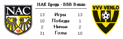 Встреча команд из нижней части турнирной таблицы. Но в которой есть очевидный фаворит. "Бреда" опережает своего соперника на четыре очка и выступает куда убедительнее "Венло", который только в прошлом туре прервал серию из четырех поражений подряд. Прервал, кстати, красиво, разгромом РКС. К слову, одержав первую победу в нынешнем сезоне. Может, это был сигнал возрождения команды? "Бреда" же выступает на своем привычном уровне. В прошлом туре проиграла "Де Графсхапу", хотя в целом смогла выправить положение после провального начала сезона - три победы в последних пяти матчах. В прошлом сезоне эти противники встречались трижды. В Кубке Голландии и в первом круге чемпионата домашние победы одержала "Бреда". Зато в конце сезона "Венло" смог разгромить "крыс". В этом сезоне "Венло" испытывает большие проблемы с игрой на выезде. Все четыре выездные встречи команда проиграла, забив лишь один гол, а пропуская в среднем по 3,5 мяча.