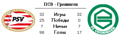 | Статистика встреч: 51-20-17 (180:85) | | Сезон 2010/2011 | | 15.05.2011 Гронинген - ПСВ Эйндховен - 0:0 | | 25.09.2010 ПСВ Эйндховен - Гронинген - 1:1 | | | | Сезон 2009/2010 | | 18.04.2010 ПСВ Эйндховен - Гронинген - 3:1 | | 30.08.2009 Гронинген - ПСВ Эйндховен - 0:2 | | | | Сезон 2008/2009 | | 21.02.2009 Гронинген - ПСВ Эйндховен - 0:1 | | 06.12.2008 ПСВ Эйндховен - Гронинген - 4:2 | | | | Сезон 2007/2008 | | 22.03.2008 ПСВ Эйндховен - Гронинген - 3:0 | | 26.12.2007 Гронинген - ПСВ Эйндховен - 2:1 | | | | Сезон 2006/2007 | | 24.02.2007 ПСВ Эйндховен - Гронинген - 1:0 | | 09.12.2006 Гронинген - ПСВ Эйндховен - 0:2 | |