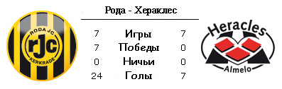 Набрав лишь одно очко в двух последних матчах, "Хераклес" здорово навредил своему положению в турнирной таблице, но, учитывая, что соперниками альмельцев в этих играх были ПСВ и "Твенте", можно даже такой результат считать весьма удачным. Тем не менее, теперь команде Петера Боша необходимо срочно наверстывать упущенное, и для начала выездная победа над "Родой" совсем не помешала бы. Но и керкрадцы дома у себя статистами точно не выступят. Команда совершенно точно приложит все усилия, чтобы реабилитироваться за три подряд домашних фиаско. Интересно, что на поле керкрадцев "Хераклес" ни то что не выигрывал, а даже не играл вничью. Семь матчей и все семь побед "Роды".