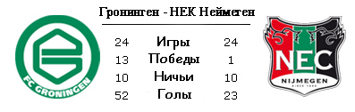 В матче открытии субботней программы тура "Гронинген" примет НЕК. "Северяне" двенадцать кряду домашних поединков не проигрывали "Неймегену" и постараются продлить эту успешную серию. Более того, в прошлом туре подопечные Питера Хюистры потерпели сокрушительное поражение в Эйндховене (6:1). НЕК на выезде не производит должного впечатления, хотя последняя поездка, а именно в Роттердам, получилась успешной, был обыгран "Фейеноорд". Всего же на выезде подопечные Пастора заработали четыре очка и забили при этом три гола. Наибольшее предпочтение стоит отдать хозяевам, которые должны реабилитироваться, но в каком они находятся психологическом состоянии, тоже вопрос.