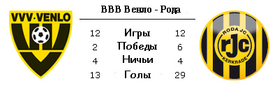 После того, как "Эксельсиор" отстоял дома ничью против АЗ и набрал своё девятое очко в сезоне, "Венло" официально стал худшей командой чемпионата. И ведь нет в этом ни капли какой-то несправедливости, всё абсолютно по делу. Плохая игра в защите, нехватка мастерства в атаке. Да что говорить, если даже тренер бросил команду, осознав, что ничего хорошего с ней не добьётся. Ничего хорошего это "Венло" не сулит, и очевидно, что "Рода" должна пользоваться разрухой в стане соперника. Учитывая разыгравшуюся в последнее время атаку керкрадцев, в предстоящем матче шансов у гостей на победу будет куда больше, чем у их соперника. Тем не менее, в случае успеха хозяев, им вновь удастся покинуть последнее место.
