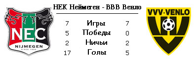 Неплохой шанс улучшить турнирное положение имеет "Неймеген". Несмотря на неплохой уровень игры, НЕК до сих пор болтается на самом пороге зоны вылета, откуда команде Алекса Пастора нужно срочно убираться. Всё-таки, вылет в Ээрсте - это не то, чего заслуживают "Грифоны". К счастью хозяев, соперник у них будет из разряда тех, кого обыгрывать они просто обязаны. Несмотря на сенсационную победу над "Родой", "Венло" остается одним из слабейших коллективов Эре, а заодно и прямым конкурентом "Неймегена" в предстоящей борьбе за выживание. НЕК уже четыре тура кряду не может порадовать своих болельщиков победой, но не стоит и забывать какие соперники были у "грифонов". И если сейчас не побеждать, то когда?