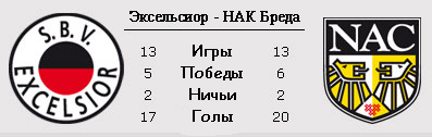 Главный аутсайдер первого круга роттердамский "Эксельсиор" примет на своём поле "Бреду". НАК, в свою очередь, располагается в середине турнирной таблице. И вряд ли подопечным Джона Карелса придётся бороться за выживание, но в тоже время и за еврокубки вряд ли удастся зацепиться. "Эксельсиор", как всегда, арендовал парочку молодых и толковых ребят в зимнее трансферное окно, чтобы хоть как-то выправить ситуацию. Так у "Фейеноорда" был взят защитник Барт Шенкевельд, а из "Виллема" Ранжело Янга. Помогут ли они клубу из Роттердама, покажет лишь время, а пока стоит сосредоточиться на поединке против НАКа.