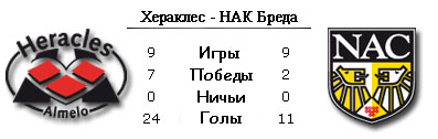 Интересное противостояние. Хотя бы тем, что соперники примерно равные друг другу в классе и постараются зацепиться за очки. "Хераклес" в прошлом сезоне смог выпрыгнуть из кожи вон и зацепиться за зону плей-офф к Лиге Европы. А вот НАК выступил похуже, чем ожидалось, и застрял в середине таблицы. Хотя оцениваются коллективы как раз в обратном соотношении. У "Бреды" есть шанс доказать это. В первом туре НАКу пришлось нелегко - принимать дома "Твенте". Команда из Бреды проиграла со счетом 0:1. Неудачно провел матч и "Хераклес", встречавшийся со слабеньким РКС. Ведя со счетом 2:0 к 85-й минуте, "гераклы" умудрились закончить матч ничьей - 2:2. В прошлом сезоне "Хераклес" оба матча выиграл. Вообще, НАК обыгрывал "гераклов" лишь в 2008-м году в последний раз.