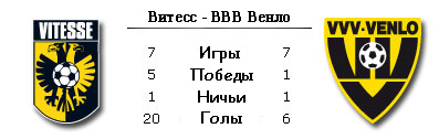 В прошлом сезоне эти команды обхаживали нижнюю половину турнирной таблицы. И если "Витессу" удалось избежать неприятностей, то "Венло" пришлось поучаствовать в стыковых матчах за право сохранить прописку в элитном дивизионе. И стыки были выиграны. Но вряд ли ситуация серьезно изменится в этом сезоне. Опять команде придется биться за выживание. И именно в таких матчах с себе подобными нужно набирать очковую массу. Хотя в прошлом сезоне у "Венло" ничего не вышло - оба матча выиграл "Витесс". Причем на своем поле тогда "Венло" был разбит со счетом 1:5, а в гостях 0:2. В первом туре обе команды набрали по одному очку в свою копилку, не забив при этом, ни одного гола.