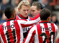 | Все лидеры, кроме "Твенте", закономерно набрали по три очка в отчётном туре. Открывался тур поединком между "Хераклесом" и "Твенте". Никаких поводов к тому, что подопечные Стива Макларена уступят, не было. За энсхедцами мы не наблюдали аж две недели, так как в прошлом туре свой матч они не сыграли из-за климатических условий. Может это, а может ещё что, повлияло на первое поражение "красных" под руководством Макларена. "Хераклес" же продолжает удивлять. Обычно мы привыкли видеть, как эта команда преподносит неожиданные результаты против лидеров на своём поле, а вот теперь и в гостях. С такой интересной игрой можно попробовать и за еврокубки зацепиться. Впрочем, настрой на матчи с лидерами это хорошо, но со своими прямыми конкурентами также нельзя терять очков, что с альмельцами частенько происходит. Продолжился тур субботней программой, состоящей из четырёх матчей. Главный интерес вызывали поединки в которых играли АЗ и "Аякс". И те, и другие, одержали одинаковые победы, отгрузив в ворота "Эксельсиора" и "Бреды", соответственно, по два мяча. Алкмаар показал, по-настоящему, чемпионскую игру. И моментов подопечные Вербеека создали достаточно и комбинации были на загляденье. А вот "Аякс" одержал скорее трудовую победу, нежели красивую. Огромный вклад в успех внёс Дмитрий Булыкин, который открыл счёт в матче. Наконец-таки, россиянину предоставился шанс сыграть с первых минут и он доказал, что претендует на место в стартовом составе. К слову, полезных действий у Булыкина было предостаточно. Он всегда не передерживал мяч, постоянно отыгрывал на партнёров, которые наоборот, не видели россиянина. И даже в перекладину в одном из эпизодов угодил. Помимо "Твенте", ещё одну сенсацию преподнёс "Гронинген". Уже третий тур кряду подопечные Хюистры терпят поражение и на этот раз от безобидного, на первый взгляд, "Венло", который борется за выживание. Проблемы у "Северян" были заметны ещё недели две назад, но теперь они просто на лицо. Ещё один лидер, ПСВ, также без особых проблем набрал три балла, разгромив на своём поле "Де Графсхап" (4:1). Интересно, что в этом поединке у эйндховенцев забили практически все игроки линии атаки, да чего уж там, действительно все. Разве что Лабиад не записал гол на свой счёт, но Закария отличался в туре прошлом. Продолжают погоню за лидерами "Фейеноорд" и "Херенвен". Роттердамцы в лице Джона Гуидетти восхищают. Швед уже три матча кряду делает "хет-трик". Причём два "хет-трика" из трёх пришлись в ворота конкурентов - "Аякса" и "Твенте". Вот и на этот раз Джон умудрился вкатить три мяча, на этот раз в ворота "Витесса" - команды также из верхней части таблицы. Игра "Фейе" действительно строится через него, достаточно вспомнить недавнее поражение от "Венло". В том матче Гуидетти как раз не было. Вся команда как будто заряжается от шведа. Прямо прототип Ибрагимовича в "Милане", правда шустрее и интереснее. Из этого парня может вырасти действительно серьёзный футболист. "Херенвен" в этот раз сыграл не очень внятно и забил всего лишь один гол, причём лучший снайпер Эре Бас Дост не забил, а сделал голевую передачу. Ключевым моментов в матче с РКС стало удаление у "Валвейка", а посему, "фризы" и оказались сильнее. "Утрехт" и "ден Хааг" победителя не выявили, а вот "Рода" с минимальным счётом одолела НЕК. Правда, стоит отметить, что Неймеген играл гораздо интересн