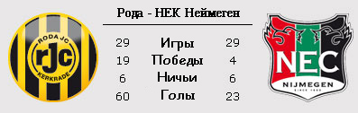 "Рода" находится в первой десятке и именно у керкрадцев больше всех поражений из этих команды - целых десять. И тем не менее, в последнее время, подопечные Харма ван Вельдховена показывают весьма добротный футбол. Очень хорошо проявляет себя Митчелл Дональд, ещё лучше играет Сенхариб Малки. Про сирийца вообще отдельная история. В прошлом туре он забил гол красавец пяткой, да и вообще в своём первом сезоне за "Гордость Юга" ему уже удалось наколотить 14 мячей, что на целых 9 больше, чем у Юнкера. А ведь именно датчанин последние годы был лучшим бомбардиром команды, но в этом сезоне скорострельностью похвастаться не может. Что касается НЕКа, тот тут тоже вопрос не стабильности. Самое интересное, что лучший снайпер команды Мелвин Платье продолжает сидеть на скамейке запасных и у команды попросту отсутствует забивной форвард. Да, Зеефуйк в последних матчах заметно прибавил, но забивать у него никак не получается. В прошлом туре подопечные Пастора уступили "Фейеноорду", прервав свою трёхматчевую победную серию. Отобрать очки у "Роды", тем более на их поле, задача не из лёгких.