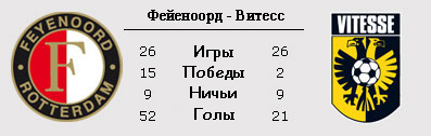 | Статистика встреч: 24-22-7 (89:47) | | Сезон 2011/2012 | | 20.11.2011 Витесс - Фейеноорд - 0:4 | | | | Сезон 2010/2011 | | 06.02.2011 Витесс - Фейеноорд - 1:1 | | 29.08.2010 Фейеноорд - Витесс - 4:0 | | | | Сезон 2009/2010 | | 31.03.2010 Фейеноорд - Витесс - 2:1 | | 09.08.2009 Витесс - Фейеноорд - 0:0 | | | | Сезон 2008/2009 | | 01.03.2009 Фейеноорд - Витесс - 2:2 | | 30.11.2008 Витесс - Фейеноорд - 1:1 | | | | Сезон 2007/2008 | | 17.02.2008 Фейеноорд - Витесс - 1:0 | | 07.10.2007 Витесс - Фейеноорд - 0:1 | | | | Сезон 2006/2007 | | 01.04.2007 Витесс - Фейеноорд - 0:1 | | 05.11.2006 Фейеноорд - Витесс - 2:1 | |