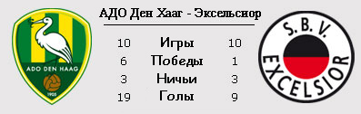После унижения от АЗ, "Ден Хааг" сумел лишь вырвать ничью у "Утрехта" в следующем туре. Самое интересное, что столь крупное поражение не загнало команду в психологический кризис и она ещё может показывать зубы. "Аисты" находятся в нижней части турнирной таблицы, что, впрочем, привычное зрелище. Прошлый сезон болельщики ещё долго будут вспоминать с улыбкой на лице, ведь удалось вырваться в зону еврокубков и даже поиграть там на первых стадиях. Когда теперь такое будет или будет ли вообще... "Эксельсиор" пусть и записной аутсайдер, но не сдаётся и в каждом матче выкладывается на все сто, чередуя поражение и победу. В результате этих стараний даже удалось покинуть последнее место, которое сразу отправляет в низший дивизион. И в матче с проблемным "Ден Хаагом" у роттердамцев есть хорошие шансы зацепиться за очки, тем более что конкуренты сыграют между собой.
