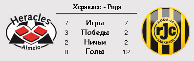 | Статистика встреч: 3-3-11 (18:42) | | Сезон 2011/2012 | | 26.11.2011 Рода - Хераклес - 3:1 | | | | Сезон 2010/2011 | | 06.02.2011 Хераклес - Рода - 1:0 | | 28.08.2010 Рода - Хераклес - 4:2 | | | | Сезон 2009/2010 | | 19.02.2010 Рода - Хераклес - 2:1 | | 28.11.2009 Хераклес - Рода - 3:2 | | | | Сезон 2008/2009 | | 30.01.2009 Рода - Хераклес - 3:1 | | 04.10.2008 Хераклес - Рода - 2:0 | | | | Сезон 2007/2008 | | 29.03.2008 Хераклес - Рода - 0:0 | | 24.08.2007 Рода - Хераклес - 2:1 | | | | Сезон 2006/2007 | | 29.04.2007 Рода - Хераклес - 7:0 | | 02.12.2006 Хераклес - Рода - 1:1 | |