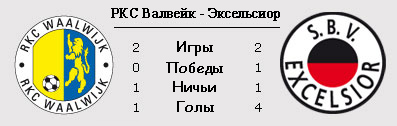 | Статистика встреч: 2-1-2 (6:6) | | Сезон 2011/2012 | | 29.10.2011 Эксельсиор - РКС Валвейк - 1:0 | | | | Сезон 2006/2007 | | 14.04.2007 Эксельсиор - РКС Валвейк - 0:3 | | 26.08.2006 РКС Валвейк - Эксельсиор - 1:1 | |
