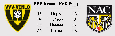 | Статистика встреч: 5-8-14 (33:50) | | Сезон 2011/2012 | | 28.10.2011 НАК Бреда - ВВВ Венло - 3:1 | | | | Сезон 2010/2011 | | 05.02.2011 ВВВ Венло - НАК Бреда - 3:0 | | 28.08.2010 НАК Бреда - ВВВ Венло - 2:0 | | | | Сезон 2009/2010 | | 30.01.2010 НАК Бреда - ВВВ Венло - 2:0 | | 30.10.2009 ВВВ Венло - НАК Бреда - 1:1 | | | | Сезон 2007/2008 | | 12.01.2008 НАК Бреда - ВВВ Венло - 0:0 | | 21.09.2007 ВВВ Венло - НАК Бреда - 1:3 | |