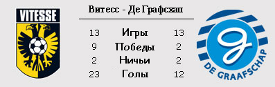 "Витесс" практически полностью провалил начала второго круга, одержав всего одну победу в шести матчах, все остальные поединки подопечные Джона ван ден Брома проиграли и в результате находятся в девяти очках от шестого места. Впрочем, как говорил сам наставник арнемцев, задач попасть в плей-офф розыгрыша путёвки в Лигу Европы и пока, "Витесс", находится на нужном месте. Другое дело, что на расстояние одной победы подобрались сразу три команды. "Рода" и "Гронинген" уже сегодня могут обойти арнемцев, если те проиграют одному из главных аутсайдеров - "Де Графсхапу", во что верится с трудом. "Суперфермеры" могут считать себя в этом сезоне именно гостевой командой, поскольку за пределами родного Дутинхема команда набрала больше очков. Весьма неожиданную победу дутинхемцы одержали в прошлом туре, обыграв на выезде "Роду". Правда по игре всё должно было быть иначе. В общем матч получился из разряда одни атакуют, а забивают другие. У "Витесса" есть хорошие шансы закрепиться на седьмом месте, но для этого надо побеждать.