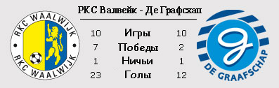 | Статистика встреч: 11-4-6 (43:31) | | Сезон 2011/2012 | | 16.12.2011 Де Графсхап - РКС Валвейк - 1:3 | | | | Сезон 2004/2005 | | 16.04.2005 Де Графсхап - РКС Валвейк - 2:4 | | 14.11.2004 РКС Валвейк - Де Графсхап - 2:2 | |