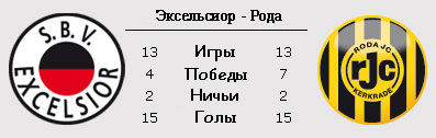 "Эксельсиор" последние три тура проиграл в чистую. Впрочем и "Рода" лишь в прошлом туре прервала такую же неудачную серию. Керкрадцы дома обыграли "Венло" (3:1). "Эксельсиору" же в соперники доставались весьма непростые коллективы. И набравший неплохой ход амстердамский "Аякс", и команда открытие нынешнего сезона "Херенвен", а также середняк "Валвейк". Для роттердамцев все соперники непростые, поскольку "Эксельсиор", пожалуй, самый главный аутсайдер Эре. "Рода" в прошлом туре не просто победила, а даже забралась на 8-е место в таблице, которая даёт право разыграть третью путёвку от представителей Голландии в Лигу Европы. Но такое положение дел заслуга не только "Роды", но и "Гронингена", который это самое место уступил. Для роттердамцев каждое очко, как навес золота, вот только выкладываться надо в каждом матче на все 100 процентов и надеяться на удачу.