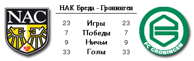 НАК, не так давно слывший весьма крепким коллективом, старт сезона просто провалил, став одной из двух команд, которые не набрали пока ни одного очка. "Бреда" уступила в двух матчах. Сначала "Твенте" (0:1), а потом "Хераклесу" (1:2). Так что нужно обязательно приступить к набору очков, пока в отрыв народ не стал уходить. "Гронинген" все же был успешнее. Проиграв "Роде", эта команда смогла собраться и уверенно одолеть АДО Ден Хааг (4:2). В прошлом сезоне в этой паре успех праздновали именно северяне. "Гронинген" оба матча выиграл с минимальным перевесом - 2:1 и 1:0. Примечательно, что в первом матче блестал нынешний уже игрок "Дженоа" и бывший капитан "Гронингена" Андреас Гранквист. Он вначале забил в свои ворота, а затем сделал дубль в чужие. Ко всему прочему у "Бреды" имеются существенные кадровые проблемы, в то время как у гостей их практически нет. Да и связка в атаке Тадич-Матавж весьма опасна, что и доказал предыдущий тур.