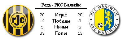 Оба коллектива в прошлом туре потерпели поражения, но такие разные. "Рода" по всем статьям уступила "Фейеноорду", который беспощадно уложил три мяча в ворота Титона, который, кстати, уже не числится в команде. Польский кипер на неделе был отдан в аренду ПСВ и теперь место в воротах займёт другой поляк Матеус Прус. В этом, пожалуй, и есть главная потеря керкрадцев. Зато возвращается в обойму Рууд Вормер. Опорник в первом туре был удалён с поля и в разгроме своей команды участия не принял, возможно в этом и кроется одна из причин такого унижения в Роттердаме. А вот "Валвейк" вполне мог отнять очки у ПСВ, ведь подопечные Рууда Бруду на равных боролись с грандом голландского футбола, однако опыта и исполнительского мастерства не хватило, чтобы заработать хотя бы очко. На своём поле "Рода" вряд ли поделится с соперником очками, тем более с аутсайдером. РКС несомненно потреплет нервишки, но второе поражение кряду болельщики нынешних хозяев вряд ли воспримут.